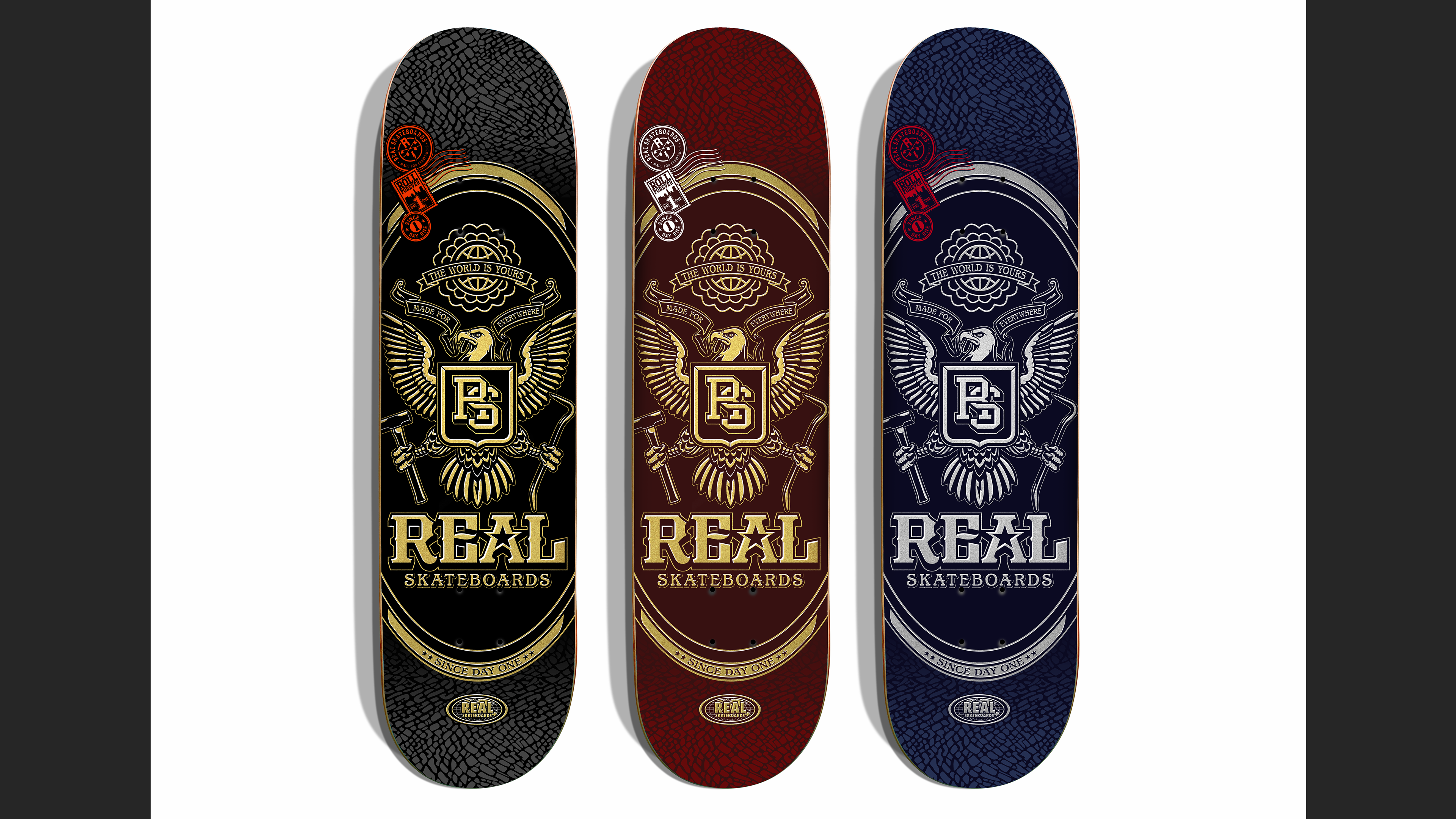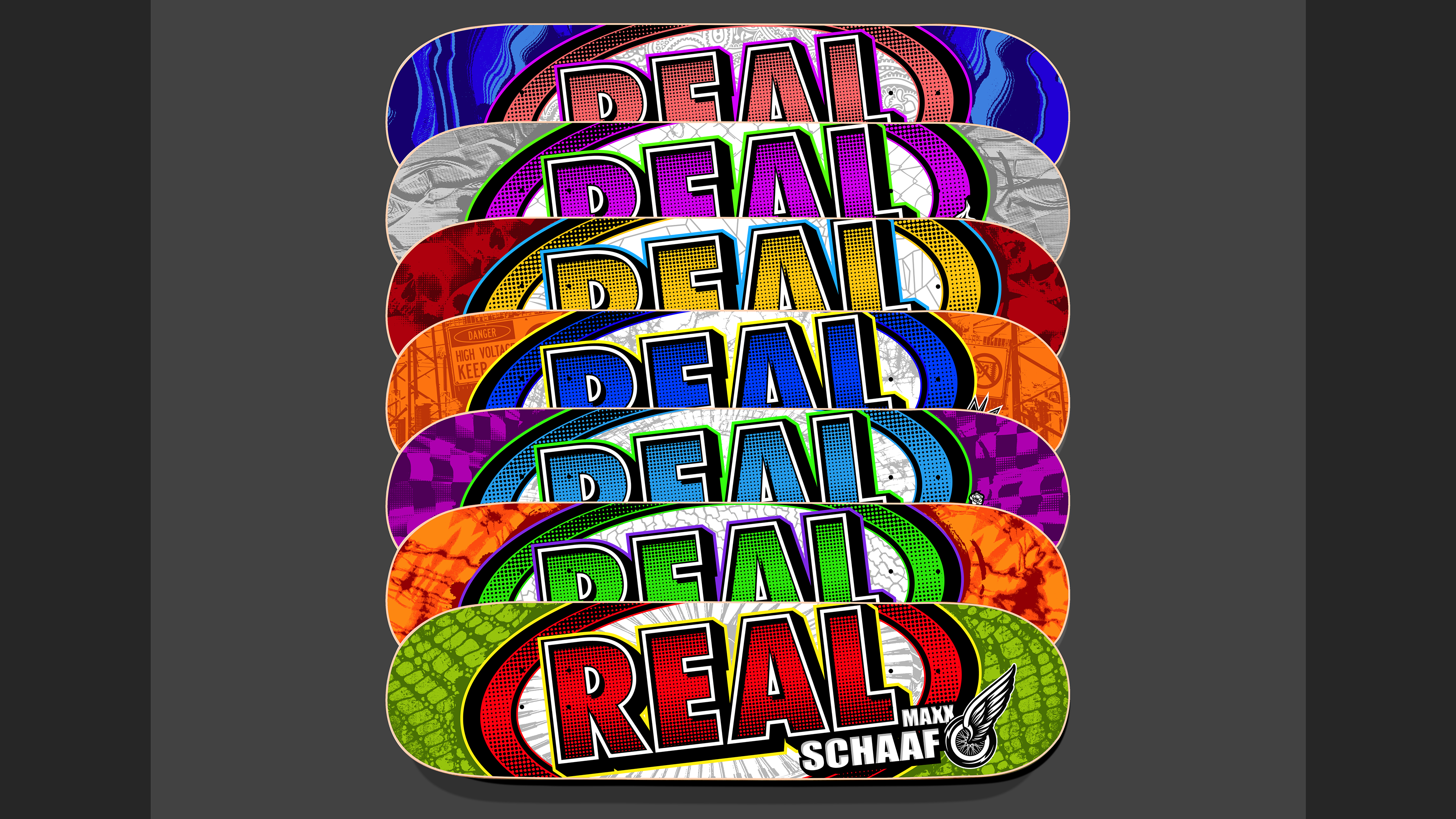 A collection of graphics for REAL Skateboards, Spitfire Wheels, and Thunder Trucks.